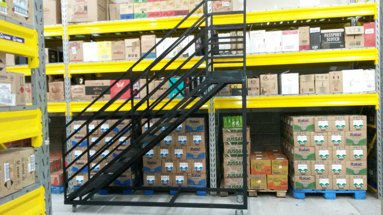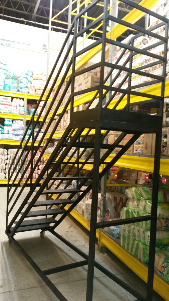 ESCADAS COM 1 PLATAFORMA PARA DEPÓSITOS COM ALCANCE DE ATÉ 4 METROS DE ALTURA (PEDIDO DO CLIENTE), COM CORRIMÕES DE DOIS LADOS, CORRENTE DE PROTEÇÃO, DEGRAUS E PATAMARES ANTIDERRAPANTES