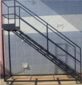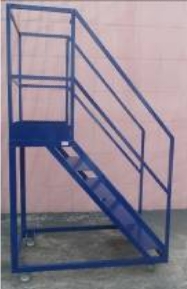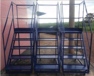 ESCADAS COM 2 PLATAFORMAS COM ALCANCE DE ATÉ 6 METROS DE ALTURA, COM CORRIMÕES DE DOIS LADOS, CORRENTE DE PROTEÇÃO, DEGRAUS E PATMARES ANTIDERRAPANTES